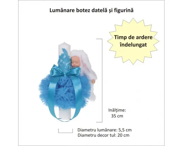 Lumanare botez cu iepuras pufos si trusou botez in landou, decor dantela Turcoaz, Denikos® 861 DESCRIERE Set special creat pentru ceremonia de botez. Setul este alcatuit din trusou complet ambalat intr-o cutie tip landou si o lumanare decorata cu un glob din tul turcoaz, dantela, fundita asortata si un iepuras pufos simpatic. Setul contine: - cutie de trusou in forma de landou; - prosop cu gluga pentru bebelus, dimensiuni 80 x 80 cm, 100% bumbac; - panza de mir, 100% bumbac; - prosop pentru preot, dimensiuni 30 x 50 cm, 100% bumbac; - fasa de botez, dimensiune 150 cm; - sticluta de mir, capacitate 100 ml; - sapunel in forma de bebelus; - cutiuta pentru suvita de par. - lumanare de botez (35 cm inaltime). PERSONALIZARE Produsul se poate personaliza cu numele copilului. Numele copilului poate fi scris prin brodare pe prosopul copilului, panza si fasa (cost suplimentar). Daca doresti personalizare, alege la optiuni cu personalizare si te vom contacta telefonic pentru a stabili detaliile. Produsul cu denumirea Lumanare botez cu iepuras pufos si trusou botez in landou, decor dantela Turcoaz, Denikos® 861 face parte din brandul Produs vandut si livrat de sc denikos creativ shop online srl, se afla in categoria Barbie si subcategoria