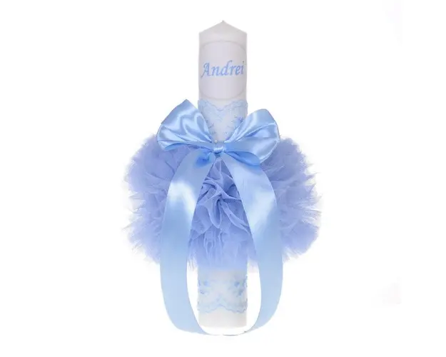 Lumanare botez personalizata si trusou botez in landou, decor Bleu cu floricele, Denikos® 774