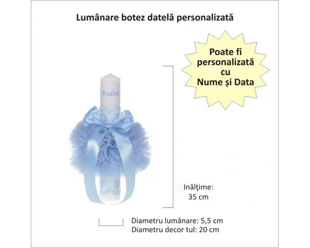 Lumanare botez personalizata si trusou botez in landou, decor Bleu cu floricele, Denikos® 774 DESCRIERE Set special creat pentru ceremonia de botez. Setul este alcatuit din trusou complet ambalat intr-o cutie tip landou si o lumanare personalizata cu numele copilului decorata cu un glob din tul bleu, dantela si fundita asortata. Setul contine: - cutie de trusou in forma de landou; - prosop cu gluga pentru bebelus, dimensiuni 80 x 80 cm, 100% bumbac; - panza de mir, 100% bumbac; - prosop pentru preot, dimensiuni 30 x 50 cm, 100% bumbac; - fasa de botez, dimensiune 150 cm; - sticluta de mir, capacitate 100 ml; - sapunel in forma de bebelus; - cutiuta pentru suvita de par. - lumanare de botez (35 cm inaltime). Lumanarea de botez este personalizata cu numele bebelusului si / sau data botezului. Dupa plasarea comenzii te vom contacta pentru comunicarea datelor pentru personalizare. PERSONALIZARE Trusoul se poate personaliza cu numele copilului. Numele copilului poate fi scris prin brodare pe prosopul copilului, panza si fasa (cost suplimentar). Daca doresti personalizare, alege la optiuni cu personalizare si te vom contacta telefonic pentru a stabili detaliile. Produsul cu denumirea Lumanare botez personalizata si trusou botez in landou, decor Bleu cu floricele, Denikos® 774 face parte din brandul Produs vandut si livrat de sc denikos creativ shop online srl, se afla in categoria Barbie si subcategoria