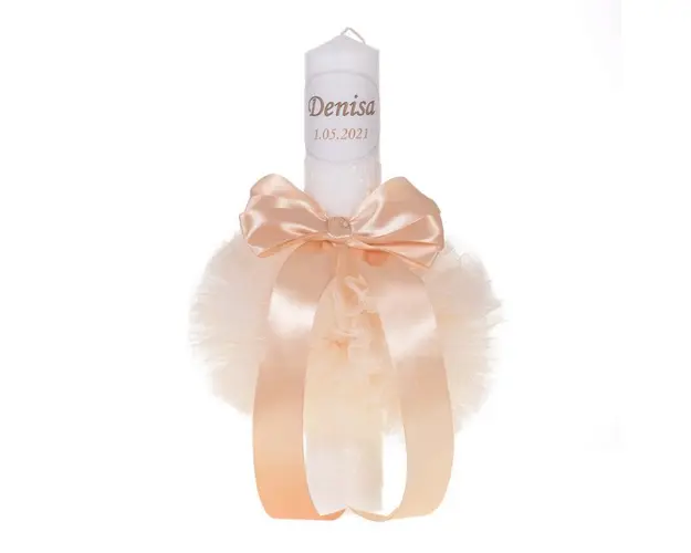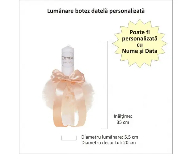 Lumanare botez personalizata si trusou botez in landou, decor Ivoire cu floricele, Denikos® 775 DESCRIERE Set special creat pentru ceremonia de botez. Setul este alcatuit din trusou complet ambalat intr-o cutie tip landou si o lumanare personalizata cu numele copilului decorata cu un glob din tul crem / ivoire, dantela si fundita asortata. Setul contine: - cutie de trusou in forma de landou; - prosop cu gluga pentru bebelus, dimensiuni 80 x 80 cm, 100% bumbac; - panza de mir, 100% bumbac; - prosop pentru preot, dimensiuni 30 x 50 cm, 100% bumbac; - fasa de botez, dimensiune 150 cm; - sticluta de mir, capacitate 100 ml; - sapunel in forma de bebelus; - cutiuta pentru suvita de par. - lumanare de botez (35 cm inaltime). Lumanarea de botez este personalizata cu numele bebelusului si / sau data botezului. Dupa plasarea comenzii te vom contacta pentru comunicarea datelor pentru personalizare. PERSONALIZARE Trusoul se poate personaliza cu numele copilului. Numele copilului poate fi scris prin brodare pe prosopul copilului, panza si fasa (cost suplimentar). Daca doresti personalizare, alege la optiuni cu personalizare si te vom contacta telefonic pentru a stabili detaliile. Produsul cu denumirea Lumanare botez personalizata si trusou botez in landou, decor Ivoire cu floricele, Denikos® 775 face parte din brandul Produs vandut si livrat de sc denikos creativ shop online srl, se afla in categoria Tetine si subcategoria