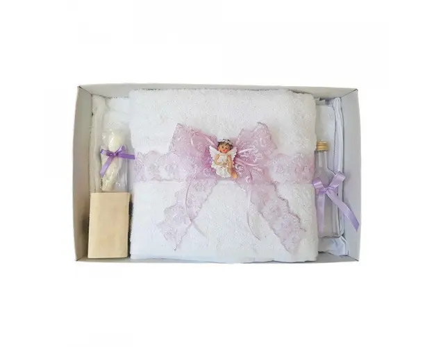Lumanare botez tul si ingeras si trusou botez dantela, decor Lila, Denikos® 625 DESCRIERE Set special creat pentru ceremonia de botez. Setul este alcatuit dintr-un trusou complet ambalat intr-o cutie dreptunghiulara si o lumanare decorata elegant cu tul, dantela, fundite asortate si un ingeras elegant. Setul contine: - cutie de trusou cu capac transparent; - prosop mare pentru bebelus, dimensiuni 70 x 140 cm, 100% bumbac; - panza de mir, 100% bumbac; - prosop pentru preot, dimensiuni 30 x 50 cm, 100% bumbac; - fasa de botez, dimensiune 150 cm; - sticluta de mir, capacitate 100 ml; - sapunel; - cutiuta pentru suvita de par. - lumanare de botez (35 cm inaltime). PERSONALIZARE Produsul se poate personaliza cu numele copilului. Numele copilului poate fi brodat pe prosopul copilului, panza si fasa (cost suplimentar). Daca doresti personalizare, alege la optiuni cu personalizare si te vom contacta telefonic pentru a stabili detaliile. Produsul cu denumirea Lumanare botez tul si ingeras si trusou botez dantela, decor Lila, Denikos® 625 face parte din brandul Produs vandut si livrat de sc denikos creativ shop online srl, se afla in categoria Tetine si subcategoria