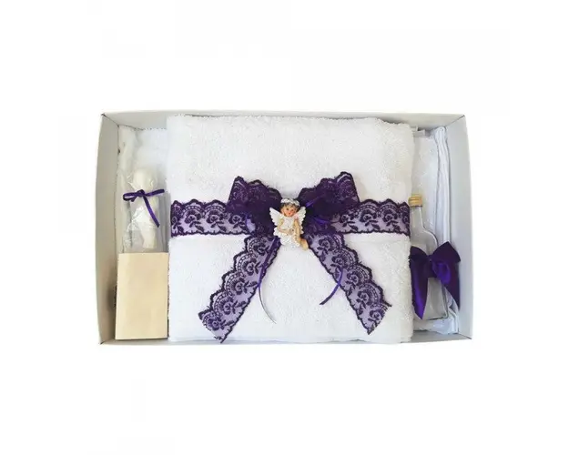 Lumanare botez tul si ingeras si trusou botez dantela, decor Mov, Denikos® 626 DESCRIERE Set special creat pentru ceremonia de botez. Setul este alcatuit dintr-un trusou complet ambalat intr-o cutie dreptunghiulara si o lumanare decorata elegant cu tul, dantela, fundite asortate si un ingeras elegant. Setul contine: - cutie de trusou cu capac transparent; - prosop mare pentru bebelus, dimensiuni 70 x 140 cm, 100% bumbac; - panza de mir, 100% bumbac; - prosop pentru preot, dimensiuni 30 x 50 cm, 100% bumbac; - fasa de botez, dimensiune 150 cm; - sticluta de mir, capacitate 100 ml; - sapunel; - cutiuta pentru suvita de par. - lumanare de botez (35 cm inaltime). PERSONALIZARE Produsul se poate personaliza cu numele copilului. Numele copilului poate fi brodat pe prosopul copilului, panza si fasa (cost suplimentar). Daca doresti personalizare, alege la optiuni cu personalizare si te vom contacta telefonic pentru a stabili detaliile. Produsul cu denumirea Lumanare botez tul si ingeras si trusou botez dantela, decor Mov, Denikos® 626 face parte din brandul Produs vandut si livrat de sc denikos creativ shop online srl, se afla in categoria Tetine si subcategoria