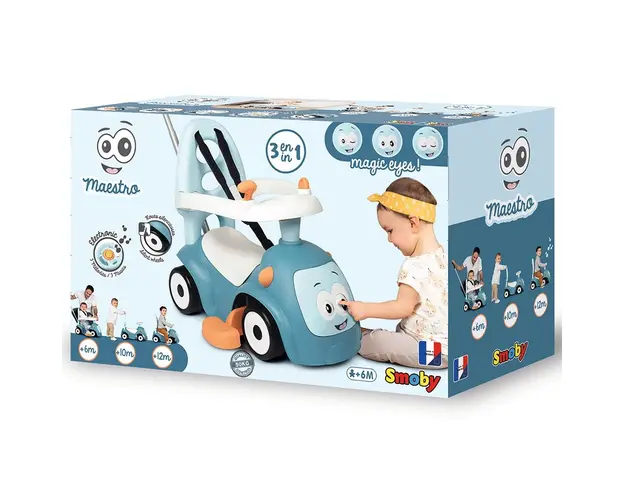 Detalii Masinuta de impins Smoby MaestroCaracteristiciMasinuta de impins Smoby Maestro este un produs multifunctional care va creste odata cu cel mic si va ajuta in dezvoltarea abilitatilor motoriiEst Produsul cu denumirea Masinuta de impins Smoby Maestro blue face parte din brandul Mebby, se afla in categoria Litere- limbaj- cifre si subcategoria