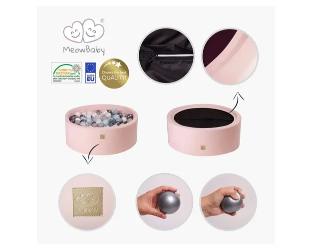 Piscina rotunda cu mingi de la Meowbaby este un cadou ideal pentru cei mici. Copiii vor fi incantati sa inoate si sa se scufunde printre mingile frumos colorate. Piscina cu mingi a fost conceputa pentru cei mici, sunt ideale pentru jocul distractiv printre bile, dar sunt de asemenea foarte utile in procesul terapeutic de integrare senzoriala. In timp ce copiii se joaca, acestia isi dezvolta abilitatile motrice fine, isi intaresc intelegerea de recunoastere a culorilor si isi dezvolta procesul de miscare si coordonarea vizuala. Mingile au o forma rotunda, fiind ideale pentru manutele celor mici.Piscina cu mingi de la Meowbaby a fost realizata din spuma moale antialergica, care garanteaza un joc sigur si vesel pentru copilul tau. Piscina are un model delicat de culoare, fiind perfecta atat pentru casele moderne, dar si pentru cele clasice. Carcasa piscinei este fixata cu un fermoar, ceea ce permite curatarea intr-o masina de spalat.CaracteristiciDiametru: 90 cmInaltime: 30 sau 40 cmGrosimea peretelui: 5 cmGrosimea la baza: 2 cmLaturile stabile si baza piscinei sunt realizate din spuma poliuretanica antialergica si poseda certificatul OEKO-TEX® Standard 100.Carcasa este fixata cu fermoar si poate fi curata la masina de spalat la 30 C. Este realizata dintr-un material textil placut la atingere (95% bumbac si 5% elastan).Diametrul mingilor este de 7 cm, sunt stralucitoare, flexibile, non toxice si inodore.Certificat CEPiscinele cu mingi de la Meowbaby sunt cusute cu tesaturi de calitate certificata. Mingile provin de la producatorul certificat, care a folosit doar materiale non toxice pentru fabricare, fiind sigure pentru copii. Produsul cu denumirea Meowbaby Piscina rotunda cu 200 mingi pentru copii Light Grey face parte din brandul Thermobaby, se afla in categoria Jocuri cu bile si subcategoria