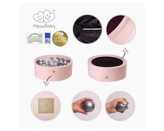 Piscina rotunda cu mingi de la Meowbaby este un cadou ideal pentru cei mici. Copiii vor fi incantati sa inoate si sa se scufunde printre mingile frumos colorate! Piscina rotunda Black vine impreuna cu mingile colorate in nuante diferite: visiniu, auriu, alb, argintiu.Aceste piscine au fost concepute pentru cei mici, sunt ideale pentru jocul distractiv printre bile, dar sunt de asemenea foarte utile in procesul terapeutic de integrare senzoriala. In timp ce copiii se joaca, acestia isi dezvolta abilitatile motrice fine, isi intaresc intelegerea de recunoastere a culorilor si isi dezvolta procesul de miscare si coordonarea vizuala. Mingile au o forma rotunda, fiind ideale pentru manutele celor mici.Piscina cu mingi de la Meowbaby a fost realizata din spuma moale antialergica, care garanteaza un joc sigur si vesel pentru copilul tau. Piscina are un model delicat de culoare, fiind perfecta atat pentru casele moderne, dar si pentru cele clasice. Carcasa piscinei este fixata cu un fermoar, ceea ce permite curatarea intr-o masina de spalat.Minunata piscina rotunda de la Meowbaby poate fi umpluta cu mingi in culorile curcubeului, doar imaginatia este limita! In functie de culorile pe care le alegem, ii vom oferi o natura unica.CaracteristiciDiametru: 90 cmInaltime: 30 cmGrosimea peretelui: 5 cmGrosimea la baza: 2 cmLaturile stabile si baza piscinei sunt realizate din spuma poliuretanica antialergica si poseda certificatul OEKO-TEX® Standard 100.Carcasa este fixata cu fermoar si poate fi curata la masina de spalat la 30 C. Este realizata dintr-un material textil placut la atingere (95% bumbac si 5% elastan).Diametrul mingilor este de 7 cm, sunt stralucitoare, flexibile, non toxice si inodore.Certificat CEPiscinele cu mingi de la Meowbaby sunt cusute cu tesaturi de calitate certificata. Mingile provin de la producatorul certificat, care a folosit doar materiale non toxice pentru fabricare, fiind sigure pentru copii. Produsul cu denumirea Meowbaby Piscina rotunda 90x30 cm cu 200 mingi pentru copii Black face parte din brandul Thermobaby, se afla in categoria Jucarii jocuri educative si subcategoria