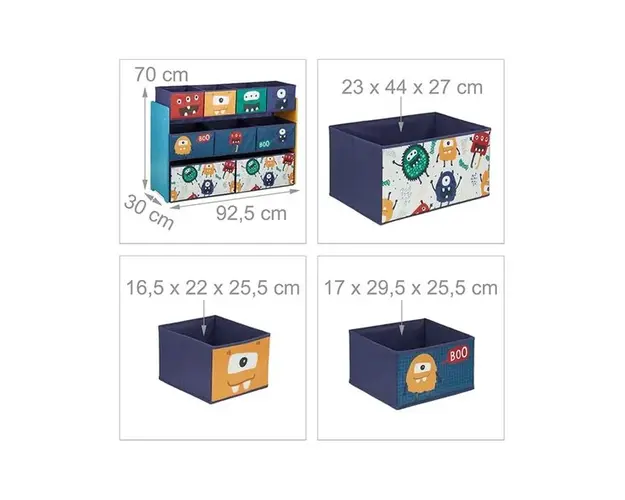 Adaugati spatiu suplimentar pentru orice camera, sufragerie sau cresa.Caracteristici- Organizatorul are 9 cutii de depozitare detasabile, textile, de diferite dimensiuni - perfecte pentru carti, jucar Produsul cu denumirea Organizator din lemn Ginger Home pentru jucarii cu 9 cutii textile Monster face parte din brandul Dunster house, se afla in categoria Costume carnaval copii si subcategoria