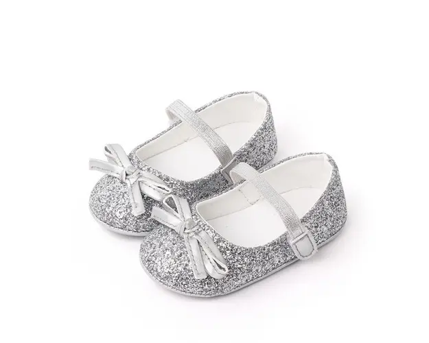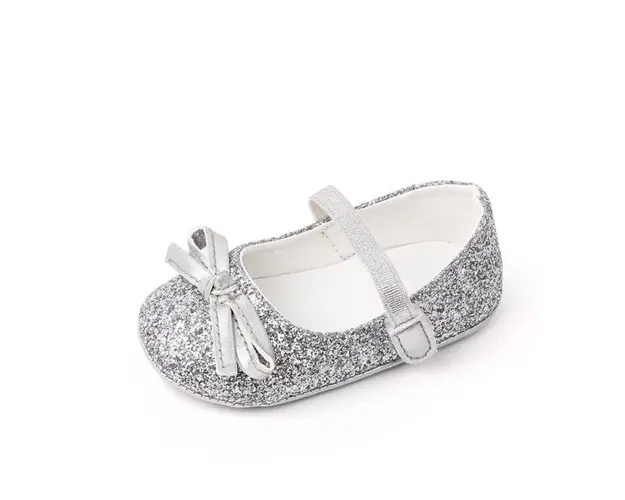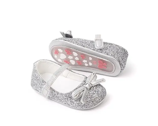 Marimi: 0-3 luni (lungimea talpitei: la interior - 10 cm; la exterior - 10,5 cm) 3-6 luni (lungimea talpitei: la interior - 10,5 cm; la exterior - 11 cm) 6-9 luni (lungimea talpitei: la interior - 11,5 cm; la exterior - 12 cm) Pantofiori pentru fetite, cu sclipici si cu o fundita aplicata in fata. Se inchid cu bareta cu arici intr-o parte. Culoare: argintiu Talpa: cauciuc moale antiderapant. Produsul cu denumirea Pantofiori argintii cu sclipici face parte din brandul Eurobaby, se afla in categoria Tetine si subcategoria