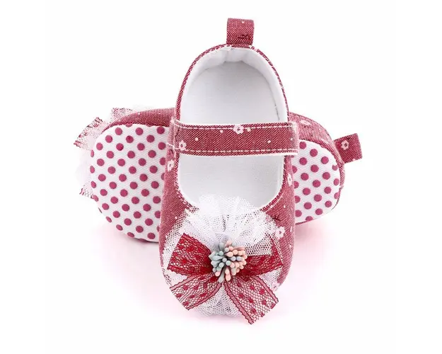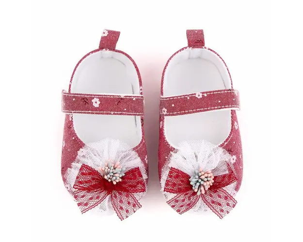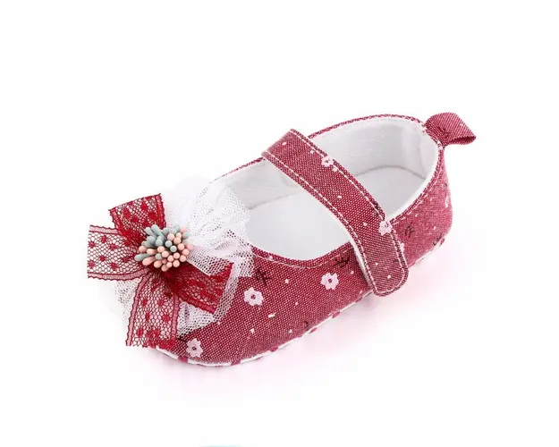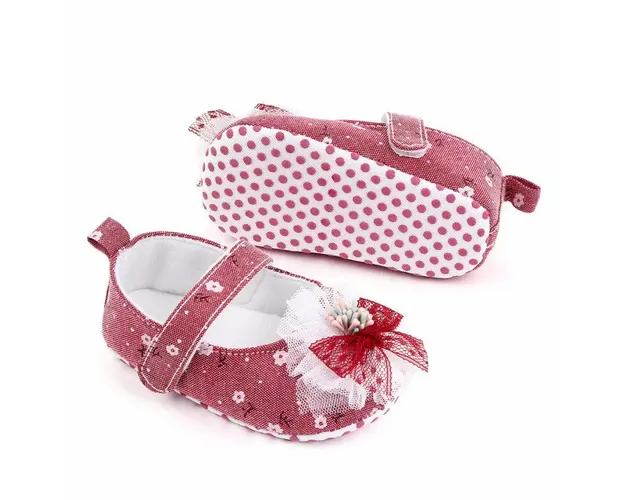 Marimi: 3-6 luni (lungimea talpitei: la interior - 10,5 cm; la exterior - 11 cm) 6-9 luni (lungimea talpitei: la interior - 11,5 cm; la exterior - 12 cm) 9-12 luni (lungimea talpitei: la interior - 12,5 cm; la exterior - 13 cm) Pantofiori pentru fetite, din material textil, cu floricele imprimate. In fata au o floricica cu fundita aplicata. Se inchid cu bareta cu arici intr-o parte. Culoare: corai Talpa: material textil cu inscriptie antiderapanta Produsul cu denumirea Pantofiori corai cu floricica si fundita face parte din brandul , se afla in categoria Tetine si subcategoria