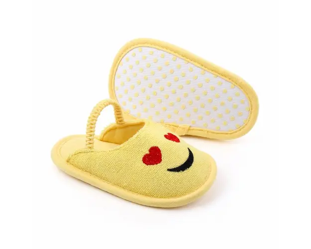 Marimi: 3-6 luni (lungimea talpitei: la interior - 10,5 cm; la exterior - 11 cm) 6-9 luni (lungimea talpitei: la interior - 11,5 cm; la exterior - 12 cm) 9 -12 luni (lungimea talpitei: la interior - 12,5 cm; la exterior - 13 cm) Pantofiori pentru fetite din material textil, in forma de emoticon cu inimioare. Sunt decupati la spate si sunt prevazuti cu elastic. Culoare: galben Talpa: material textil cu inscriptie antiderapanta. Produsul cu denumirea Pantofiori decupati pentru fetite - Love Emoticon face parte din brandul Eurobaby, se afla in categoria Tetine si subcategoria