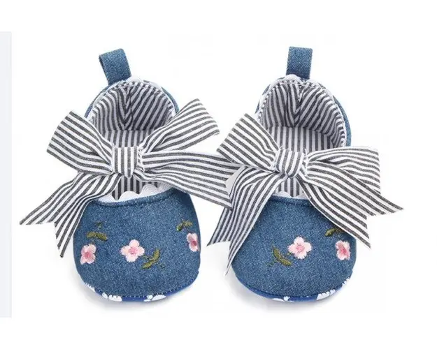 Marimi: 3-6 luni (lungimea talpitei: la interior - 10,5 cm; la exterior - 11 cm) 6-9 luni (lungimea talpitei: la interior - 11,5 cm; la exterior - 12 cm) 9 -12 luni (lungimea talpitei: la interior - 12,5 cm; la exterior - 13 cm) Pantofiori pentru fetite din material textil tip blug cu floricele brodate. Se prin de piciorus cu o bareta din elastic pe care este aplicata o funda alba cu dungulite bleumarine. Talpa este din material textil cu inscriptie antiderapanta. Produsul cu denumirea Pantofiori denim cu floricele face parte din brandul , se afla in categoria Tetine si subcategoria