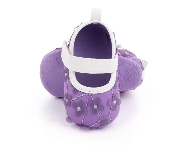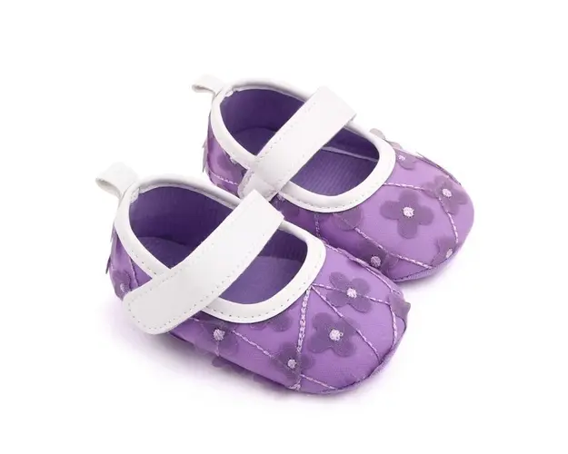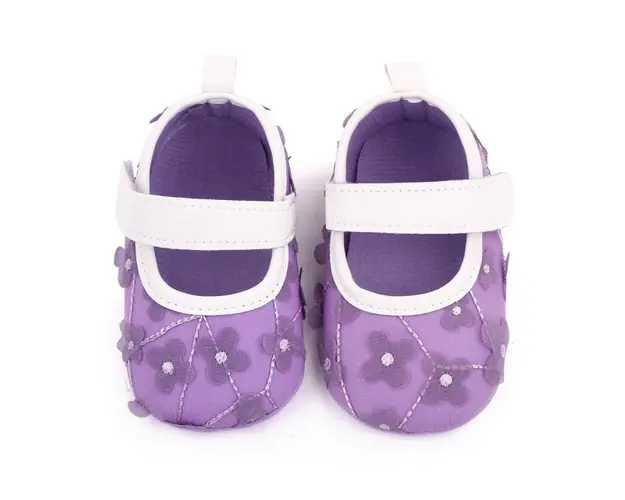 Marimi: 3-6 luni (lungimea talpitei: la interior - 10,5 cm; la exterior - 11 cm) 6-9 luni (lungimea talpitei: la interior - 11,5 cm; la exterior - 12 cm) 9 -12 luni (lungimea talpitei: la interior - 12,5 cm; la exterior - 13 cm) Pantofiori pentru fetite din material textil, cu floricele aplicate. Se inchid cu bareta cu arici intr-o parte. Culoare: mov cu insertii albe Talpa: din material textil cu inscriptie antiderapanta. Produsul cu denumirea Pantofiori mov cu floricele pentru fetite face parte din brandul Eurobaby, se afla in categoria Tetine si subcategoria