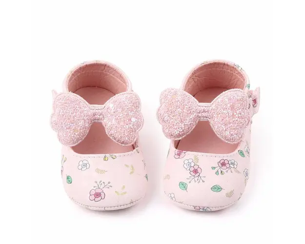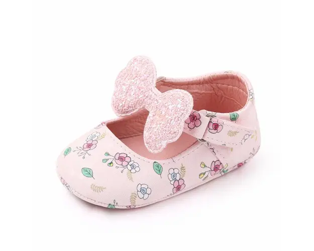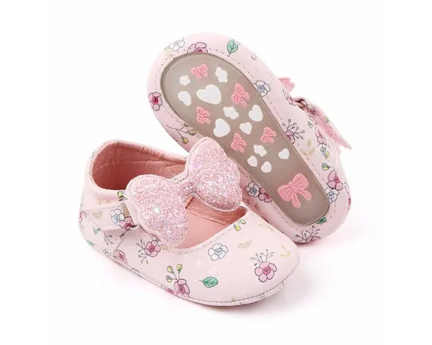 Marimi: 0-3 luni (lungimea talpitei: la interior - 10 cm; la exterior - 10,5 cm) 3-6 luni (lungimea talpitei: la interior - 10,5 cm; la exterior - 11 cm) 6-9 luni (lungimea talpitei: la interior - 11,5 cm; la exterior - 12 cm) Pantofiori pentru fetite, imprimati cu floricele, cu o funda roz sclipitoare aplicata in fata. Se inchid cu bareta cu arici intr-o parte. Culoare: roz Talpa: cauciuc moale antiderapant. Produsul cu denumirea Pantofiori roz cu floricele si fundita face parte din brandul Eurobaby, se afla in categoria Tetine si subcategoria