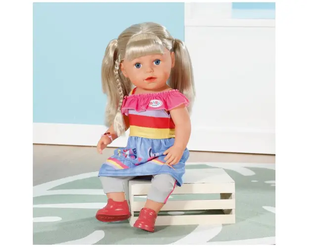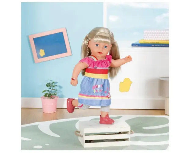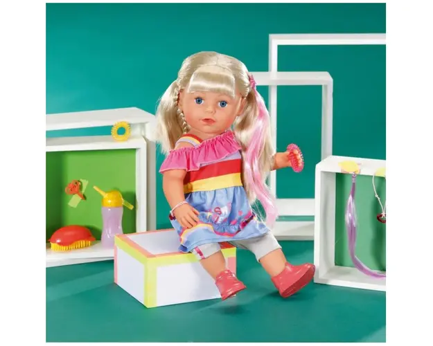 Caracteristici Papusa Baby Born Surioara blonda 43cm: Papusa Baby Born are nevoie de un copilas iubitor care sa o ingrijeasca Surioara blonda iubeste coafura si are nevoie de putin ajutor sa aleaga cea mai grozava frizura Clemele, elasticele pentru par si firele colorate de par se potrivesc perfect cu culorile tinutei sale Pune-i suvitele de par roz si violet in par Papusa poate sa bea apa din sticla Are genunchii flexibili si poate sta singura in picioare Poate face o baita in cada Poarta o rochie cu o fusta cu aspect denim si un top asimetric, iar jambierele gri cu dungi roz si treningurile rosu-portocalii se potrivesc perfect cu rochia In set vei regasi o sticla, o perie de par, 2 elastice pentru par, 2 agrafe de par, 2 agrafe cu fire de par si 1 bratara a prieteniei Are 6 functii realiste Nu sunt necesare baterii Dimensiuni: 43 cm Nu include efecte de sunete! Nu necesita baterii! Produsul cu denumirea Papusa Baby Born Surioara blonda 43cm face parte din brandul Zapf, se afla in categoria Jucarii magnetice si subcategoria