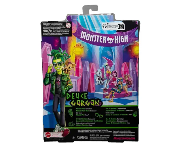 Caracteristici: Descopera papusa Monster High Deuce Gorgon cu animalut si accesori, fiul Medusei Lui i se alatura micutul Perseus, soarecele lui de companie cu o tunsoare punk. Deuce arata super cool in tinuta sa inspirata de serpi! Vine imbracat intr-o jacheta cu imprimeu de sarpe, tricou grafic cu fata de sarpe si blugi cu pantofi sport asortati cu imprimeu sarpe. Are o borseta si o sticla, precum si ochelari grozavi pe care ii foloseste pentru a-si ascunde ochii, astfel incat oamenii din jurul lui sa nu se transforme in piatra cand se uita la el! Setul contine: Papusa Monster High Deuce Gorgon Animalut de companie 7 accesorii cool Dimensiune papusa: 29 cm Produsul cu denumirea Papusa Monster High Deuce Gorgon cu animalut si accesorii face parte din brandul Mattel, se afla in categoria Jucarii magnetice si subcategoria