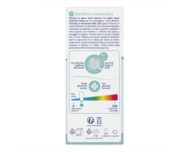- Elimina placa dentara fara a deteriora smaltul protejeaza dintii in timp ce curata eficient, mentinand smaltul intact.- Formula testata, cu abraziune redusa special conceputa pentru a proteja dintii Produsul cu denumirea Pasta de dinti Chicco cu aroma de menta 50ml 6 ani+ face parte din brandul Micro, se afla in categoria Igiena si ingrijire si subcategoria
