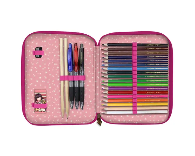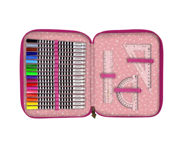 Caracteristici: Penar dublu echipat Santoro Gorjuss Carousel cu doua compartimente si este echipat cu necesarul unui scolar de instrumente de scris si o minima trusa de geometrie Instrumentele de scris sunt foarte bine structurate in interiorul penarului Gorjuss Carousel si sunt sustinute de elastice bleu In primul compartiment regasim: 2 creioane grafit, 3 pixuri cu mine de diferite culori (albastru, rosu si negru), 1 radiera, 1 ascutitoare si 18 creioane colorate In cel de-al doilea compartiment avem 18 carioci colorate, cu exterior dungat specific colectiilorSantoro-Gorjuss Penarul dublu Santoro Gorjuss contine produse de calitate si te scuteste de multa alergatura prin magazinele de papetarie Material: poliester Recomandam copiilor din clasele 0-5 Dimensiuni: 23 x 18.5 x 4 cm Greutate: 330 g Produsul cu denumirea Penar dublu echipat Santoro Gorjuss Carousel face parte din brandul Santoro london, se afla in categoria Seturi mobilier gradinita si subcategoria