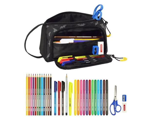 Caracteristici Penar echipat cu drop down Batman Hero 32 piese: Penarul cu buzunar drop-down echipat Batman Hero este mai mult decat un necesar pentru scoala, este un organizator perfect pentru creioane, pixuri si alte accesorii necesare scrisului si desenatului Echipat cu tot ce ai nevoie la orele de curs penarul iti ofera mai mult spatiu pe pupitru deoarece este tip pouch si il poti deschide atat prin fermoarul frontal cat si prin fermoarul aflat in partea superioara, acesta este prevazut si cu bareta de mana Pe clapeta din partea frontala sunt patru elastice de prindere si un buzunar din plasa in care se pot pastra o parte din instrumentele de scris Penarul contine: 12 creioane colorate, 12 carioci, 1 textmarker, 1 creion grafit, 1 forfeca, 1 radiera, 1 ascutitoare, 1 pix cu mina rosie, 1 pix cu mina albastra, 1 pix cu mina neagra Penar cu buzunar drop-down echipat Batman Hero are imprimat pe partea frontala designul licentei Batman Material: 100% Poliester Greutate: 300 g Dimensiuni: 20 x 8.5 x 11 cm Produsul cu denumirea Penar echipat cu drop down Batman Hero 32 piese face parte din brandul Stamco, se afla in categoria Seturi mobilier gradinita si subcategoria