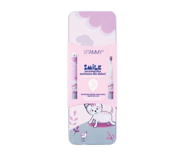 Caracteristici- Numar de vibratiimin 8000-14000- Vibratii sonice- Peri moi si delicati- 2 moduri de periaj normal si delicat- 2 capete incluse in pachet- Dimensiune periuta 1.8 x 1.8 x 16 cm- Dimensiu Produsul cu denumirea Periuta de dinti electrica Vitammy Smile animatie pisicuta face parte din brandul Vitamina g, se afla in categoria Igiena si ingrijire si subcategoria