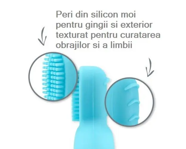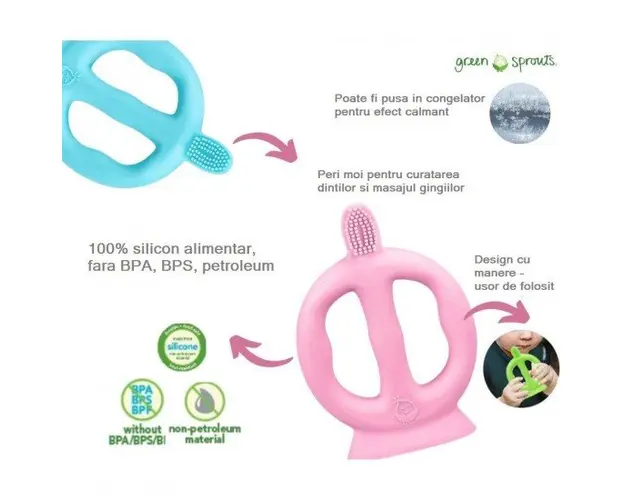 Ingrijire naturala pentrunbspcopilului tauPeriutanbspde dinti a bebelusului tau, cu manere laterale, va fi extrem de usor de folosit pentru a asigura o igiena dentaranbspcorespunzatoare bebelusului ta Produsul cu denumirea Periuta de dinti cu peri din silicon si manere Green Sprouts Green face parte din brandul Greentom, se afla in categoria Igiena si ingrijire si subcategoria