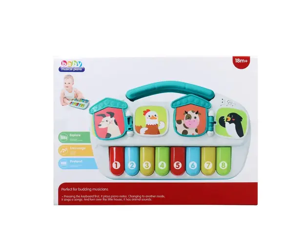 Caracteristici Pian muzical pentru bebelusi 8 clape Baby Musical: Copiii vor indragi sa se joace cu pianul muzical Baby Musical! Are 8 clape Jucaria inspira copiii sa incerce idei noi, sa gandeasca creativ si sa se exprime Deschide ferestrele din partea de sus pentru a auzi sunete amuzante de animale Include luminite Necesita 3 baterii de 1.5V AA Bateriile nu sunt incluse in set Dimensiuni: aproximativ 27 x 17 x 5 cm Produsul cu denumirea Pian muzical pentru bebelusi 8 clape Baby Musical face parte din brandul , se afla in categoria Plusuri bebelusi si subcategoria