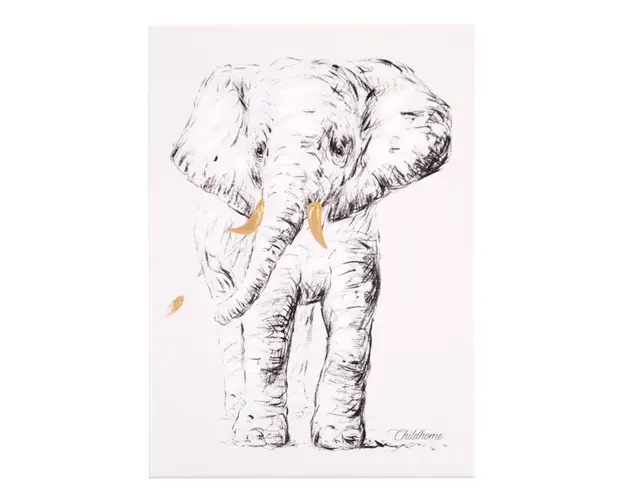 Tabloul Childhome in tonuri alb-negru, cu detalii aurii elegante, infatiseaza un Pui de Elefant in mers si este decorul perfect pentru o camera la moda.Completati-va colectia cu picturile asortate din Produsul cu denumirea Pictura in ulei Childhome 30x40 cm Elefant cu detalii aurii face parte din brandul Chipolino, se afla in categoria Costume carnaval copii si subcategoria