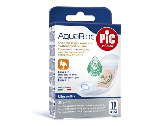 Plasturi rezistenti la apa si bacterii cu tampon absorbant care contin solutie antiseptica cu Clorhexidina Digluconat, o substanta antibacteriana cu o gama larga de actiune, care permite controlul mic Produsul cu denumirea Plasturi rezistenti la apa Pic Solution Aquabloc 25x72mm cu solutie antibacteriana 10buccut face parte din brandul Rf collection, se afla in categoria Igiena si ingrijire si subcategoria