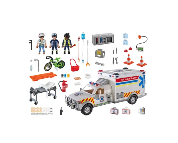 Caracteristici Playmobil PM70936 Ambulanta cu Lumini si Sunete: Curajoasa echipa de salvare Playmobil este mereu la datorie pentru a ajuta oamenii la nevoie De indata ce soseste un apel de urgenta, paramedicii iau trusa de prim ajutor si sar in vehiculul de salvare Cu lumini albastre si sirena, calatoria incepe! La fata locului, medicul examineaza biciclistul ranit si ii aplica un bandaj la cap, apoi pacientul este ridicat pe targa si legat pentru siguranta Usile din spate ale ambulantei se deschid si targa este impinsa cu grija inauntru Acum este trimis la spital pentru a fi examinat in continuare Diferite efecte luminoase pot fi declansate prin intermediul a doua butoane Acoperisurile cabinei soferului si ale caruciorului de tratament sunt detasabile Trusa doctorului si echipamentul pot fi depozitate in sertarul de sub cabina soferului Setul include: un vehicul de salvare, 4 figurine, o bicicleta, o targa de ambulanta, o trusa de doctor, o placa de diagnostic si multe alte accesorii pentru misiuni de salvare interesante Functiile electronice necesita 3 baterii 1.5V AA Produsul cu denumirea Playmobil PM70936 Ambulanta cu Lumini si Sunete face parte din brandul Playmobil, se afla in categoria Jucarii magnetice si subcategoria