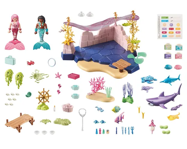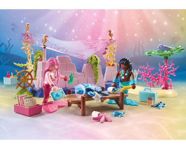 Caracteristici Playmobil PM71499 Sirene Care Ingrijesc Animale: In lumea Princess Magic, sirenele taramului subacvatic ingrijesc creaturile marine! Protejand marile si fiintele care traiesc acolo este prioritatea numarul unu a sirenelor Chiar daca ranile trebuie bandajate sau dintii de rechin curatati, fiecare animal va primi ajutor aici Setul include plante frumoase, o varietate de animale marine si 2 scoici decorative cu ventuze Setul Playmobil transporta copiii de 4 ani si mai mari intr-o lume incantatoare subacvatica in care sa isi foloseasca imaginatia Setul contine 2 figurine, 1 rechine, caluti de mare, testoasa, pui de foca si alte accesorii Numar de piese: 114 Dimensiuni: 23.5 x 24.0 x 15.5 cm Produsul cu denumirea Playmobil PM71499 Sirene Care Ingrijesc Animale face parte din brandul Playmobil, se afla in categoria Jucarii magnetice si subcategoria