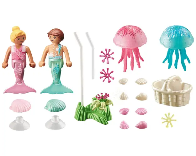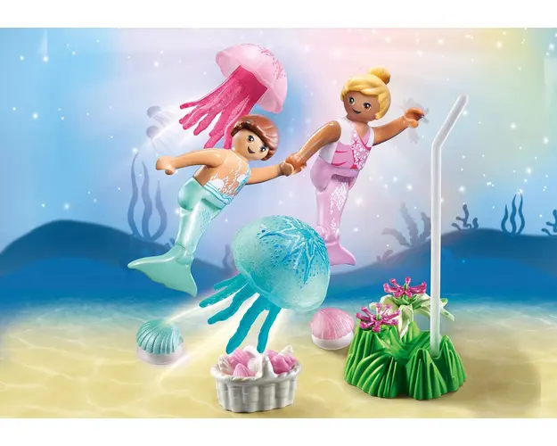 Caracteristici Playmobil PM71504 Copii Sirene cu Meduze: Copiii-sirena aduna flori si scoici in timp ce au grija si de meduza Setul contine 2 scoici decorative cu ventuze care se pot fixa pe suprafete netede Plonjeaza in aventuri distractive cu setul Copiii-sirene cu meduze! In mod curios, copii-sirena privesc 2 meduze mari care inoata in distanta Setul invita copiii intr-o lume magica subacvatica Figurinele detaliate si animalele inspira copiii de 4 ani si mai mari sa porneasca in noi aventuri imaginative Setul contine 2 figurine copil, 2 meduze si accesorii Numar de piese: 30 Dimensiuni: 7.0 x 6.0 x 11.5 cm Produsul cu denumirea Playmobil PM71504 Copii Sirene cu Meduze face parte din brandul Playmobil, se afla in categoria Jucarii magnetice si subcategoria