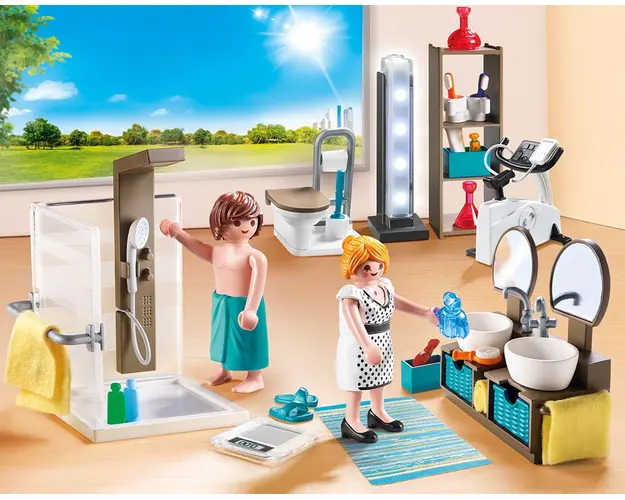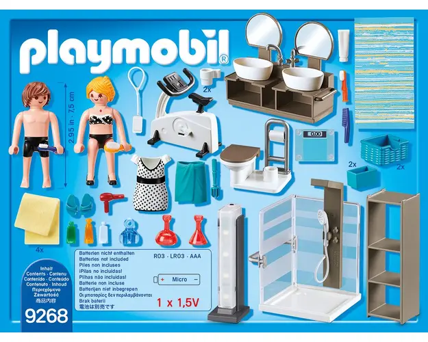 CaracteristiciPlaymobil PM9268 Baie: Relaxeaza-te in baia din casa moderna de la Playmobil Poti chiar sa iti instalezi si o bicicleta de fitness! In plus, ai si chiuveta dubla Mai intai de toate, o plimbare cu bicicleta si apoi un dus revigorantFelinarul functional (bateriile nu sunt incluse) ofera un iluminat placut Necesita o baterie 1.5V-AAA, nu este inclusa Atentie! Contine piese mici ce pot fi inghitite Setul pentru joaca Baie de la Playmobil include: Doua figurine Cabina de dus Chiuveta dubla Toaleta Bicicleta Haine de schimb Prosop Felinar si multe alte accesorii Produsul cu denumirea Playmobil PM9268 Baie face parte din brandul Playmobil, se afla in categoria Jucarii magnetice si subcategoria