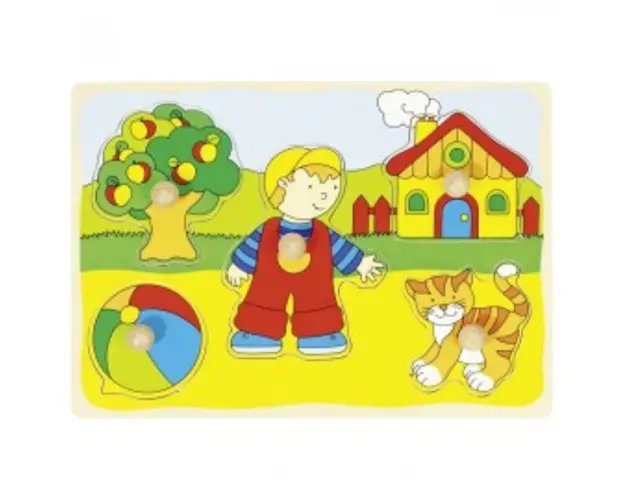 Puzzle din lemn Baietel si Pisicuta Fiecare din cele 5 piese are atasat cate un suport de care se poate prinde si ridica de pe tabla. Suportul pieselor permite acestora sa iasa in relief deasupra tablei de joc, dandu-i astfel posibilitatea copilului tau sa il prinda mai usor. Dimensiuni: 30 x 21 x 2.4 cmMaterial: lemn Nr piese: 5 Puzzle-urile ajuta la dezvoltarea miscarilor fine si a preciziei, dezvolta capacitatea de asociere si potrivire, coordonarea ochi mana, spiritul de observatie, perspicacitatea, rabdarea si capacitatea de a finaliza un proiect. Produsul cu denumirea Puzzle din lemn Baietel si Pisicuta face parte din brandul Goki, se afla in categoria Puzzle si incastre si subcategoria