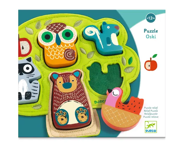 Puzzle cu animale Oski Oski este un puzzle cu tematica forestiera. O baza din pasla imprimata, placuta la atingere, in forma de copac, cu detalii brodate si 5 animale din lemn de fixat prin incastrare. Piese din lemn robuste, usor de manevrat. Animalele stau in picioare singure pentru o distractie si mai mare. Dezvolta abilitatile motorice fine. Cutie colorata, din carton gros, pentru o depozitare usoara. Dimensiune puzzle 25x21x2,2 cm. Continut: puzzle cu 5 piese din lemn si baza din pasla. Varsta recomandata: +12 luni. Confectionat din lemn si fetru, cu vopsele non-toxice certificate FSC®. AVERTISMENT: Contraindicat copiilor sub 18 luni. A se utiliza sub supravegherea unei persoane adulte. Producator: Djeco , Franta. Produsul cu denumirea Puzzle din lemn si fetru Oski, Djeco face parte din brandul Recaro, se afla in categoria Produse noi si subcategoria Raspundel istetel