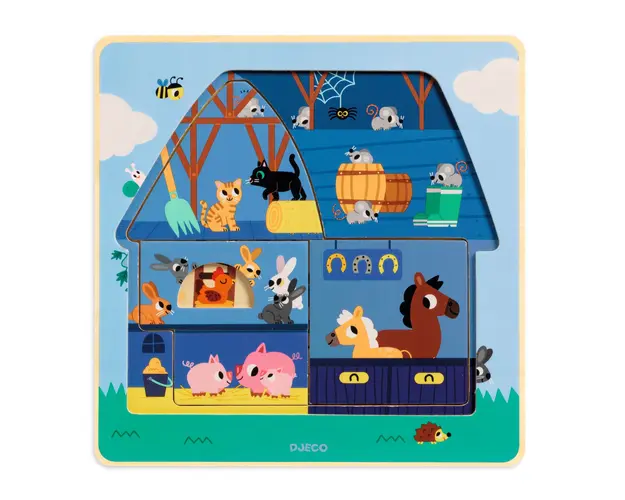 Puzzle straturi Ferma cu animale vesele Chez Moo este un puzzle din lemn cu 3 straturi si 12 piese. Exista mai multe piese care se potrivesc impreuna pentru a finaliza fiecare nivel. Pe masura ce copiii potrivesc piesele, pot invata despre viata animalelor care traiesc in hambar. Piesele mari sunt usor de manevrat de catre cei mici. Fiecare strat are o culoare diferita, pentru a facilita asocierea pieselor pentru fiecare nivel. Ilustratii colorate si detaliate pe fiecare strat. O activitate care stimuleaza concentrarea si logica celor mici. Cutie colorata, premium, usor de depozitat.Continut: puzzle din lemn cu 3 straturi. Stratul 1: 4 piese Stratul 2: 3 piese Stratul 3: 2 piese. Dimensiune puzzle: 25 x 25 x 2 cm. Varsta recomandata: +2 ani. Confectionat din lemn certificat FSC®. Conform reglementarilor EN71&ASTM. AVERTISMENT: Contraindicat copiilor sub 2 ani, contine piese mici, pericol de sufocare. A se utiliza sub directa supraveghere a unui adult. Producator: Djeco, Franta. Produsul cu denumirea Puzzle straturi Animale de la ferma, Djeco face parte din brandul Recaro, se afla in categoria Produse noi si subcategoria Raspundel istetel