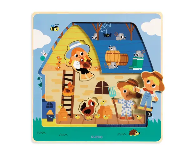 Puzzle straturi Ferma cu animale vesele Chez Moo este un puzzle din lemn cu 3 straturi si 12 piese. Exista mai multe piese care se potrivesc impreuna pentru a finaliza fiecare nivel. Pe masura ce copiii potrivesc piesele, pot invata despre viata animalelor care traiesc in hambar. Piesele mari sunt usor de manevrat de catre cei mici. Fiecare strat are o culoare diferita, pentru a facilita asocierea pieselor pentru fiecare nivel. Ilustratii colorate si detaliate pe fiecare strat. O activitate care stimuleaza concentrarea si logica celor mici. Cutie colorata, premium, usor de depozitat.Continut: puzzle din lemn cu 3 straturi. Stratul 1: 4 piese Stratul 2: 3 piese Stratul 3: 2 piese. Dimensiune puzzle: 25 x 25 x 2 cm. Varsta recomandata: +2 ani. Confectionat din lemn certificat FSC®. Conform reglementarilor EN71&ASTM. AVERTISMENT: Contraindicat copiilor sub 2 ani, contine piese mici, pericol de sufocare. A se utiliza sub directa supraveghere a unui adult. Producator: Djeco, Franta. Produsul cu denumirea Puzzle straturi Animale de la ferma, Djeco face parte din brandul Recaro, se afla in categoria Produse noi si subcategoria Raspundel istetel
