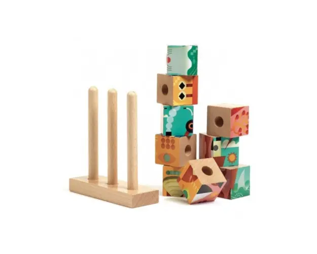 Cuburi cu animale din padure. Un alt fel de puzzle. Fiecare imagine dintre cele 4 este formata din 9 cuburi care trebuie asezate corect pe tijele verticale pentru a forma imaginea dorita. Cuburile sunt din lemn, ilustrate diferit pe fiecare latura, astfel ca trebuie gasita partea potrivita pentru fiecare ilustratie.Varsta recomandata: +3 ani.AVERTISMENT: Contraindicat copiilor sub 3 ani. Contine piese mici care pot fi inghitite.Producator: Djeco, Franta Produsul cu denumirea Puzzle vertical cu cuburi Puzz-Up Forest, Djeco face parte din brandul Recaro, se afla in categoria Produse noi si subcategoria Raspundel istetel