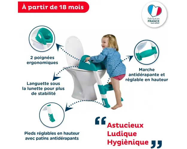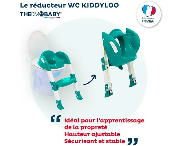 Super Copilul merge la toaleta asemenea oamenilor mariReductorul pentru toaleta cu scarita Kiddyloo este ideal pentru a-l invata pe cel mic sa mearga singur la toaleta.Forma reductorului pentru wc ii Produsul cu denumirea Reductor pentru toaleta cu scarita Kiddyloo Emeraude face parte din brandul Thermobaby, se afla in categoria Igiena si ingrijire si subcategoria