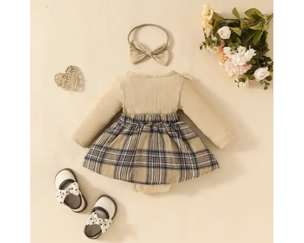 Marimi: 0-3, 3-6, 6-9, 9-12, 12-18 luni Material: 95% bumbac, 5% spandex Rochita body crem, cu manecute lungi, cu danteluta si cu fustita in carouri aplicata. Se inchide cu capse intre picioruse si este prevazuta cu o fundita in fata. Setul contine si bentita asortata. Pantofiorii din imagine sunt cu titlu de prezentare si nu sunt inclusi in pret. Produsul cu denumirea Rochita body crem cu fustita in carouri face parte din brandul Eurobaby, se afla in categoria Prepararea hranei si subcategoria
