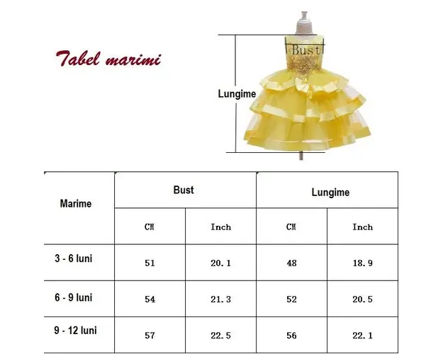 Marime: 3-6, 6-9, 9-12 luni Rochita eleganta, din saten in partea de sus si cu volane din tulle cu margini din saten perlat in partea de jos. Are aplicata danteluta si perlute Se inchide cu fermoar si cordon din satin la spate. Culoare: galben Este ideala pentru botez si pentru evenimentele deosebite din viata micutelor domnisoare. Material: 65% polyester, 35% vascoza Produsul cu denumirea Rochita de ocazie galbena cu volane face parte din brandul Eurobaby, se afla in categoria Tetine si subcategoria