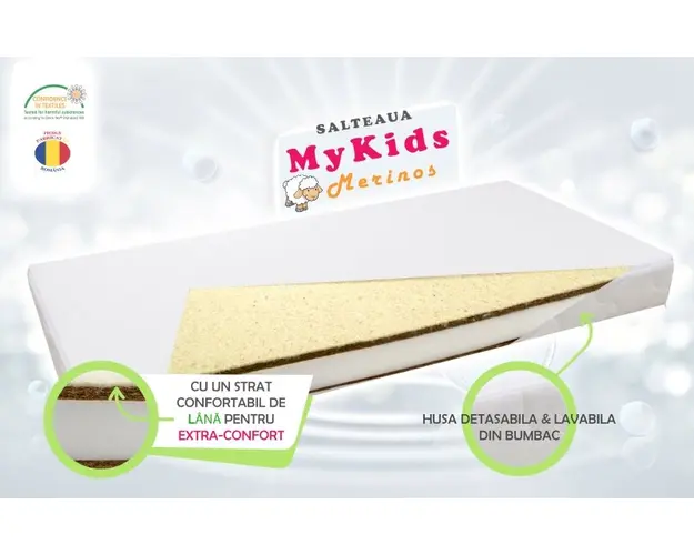 Salteaua Fibra Cocos MyKids Merinos este o saltea cu doua fetenbsplana merinos naturala si fibre de cocos,nbspcu caracteristici si nivele diferite de fermitate.nbspSalteaua poate fi folosita pe ambele Produsul cu denumirea Saltea Fibra Cocos Merinos 120x60x11 cm face parte din brandul Mykids, se afla in categoria Costume carnaval copii si subcategoria