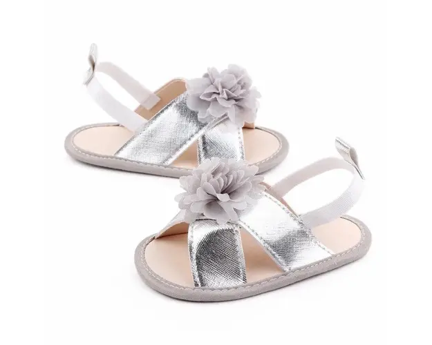 Marimi: 3-6 luni (lungime talpita 11 cm) 6-9 luni (lungime talpita 12 cm) 9-12 luni (lungime talpita 13 cm) Sandale pentru fetite, din material tip piele ecologica, cu o floricica aplicata in fata, se prind de piciorus cu elastic la spate. Culoare: argintiu Talpa: material textil cu inscriptie antiderapanta Produsul cu denumirea Sandalute argintii cu floricica face parte din brandul Superfinish, se afla in categoria Tetine si subcategoria