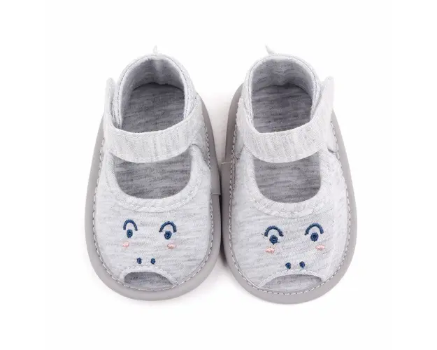 Marimi: 0-3 luni (lungime talpita 10 cm) 3-6 luni (lungime talpita 11cm) 6-9 luni (lungime talpita 12 cm) Sandale pentru baietei, inchise la spate, din material textil, in forma de animalut, se inchid cu bareta cu arici intr-o parte. Culoare: gri Talpa: material tip piele ecologica cu insertie de cauciuc antiderapant Produsul cu denumirea Sandalute gri pentru baietei - Animalut face parte din brandul Eurobaby, se afla in categoria Barbie si subcategoria