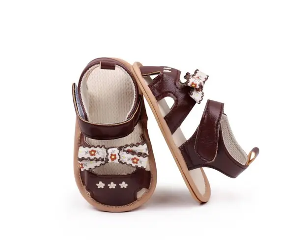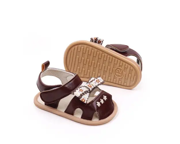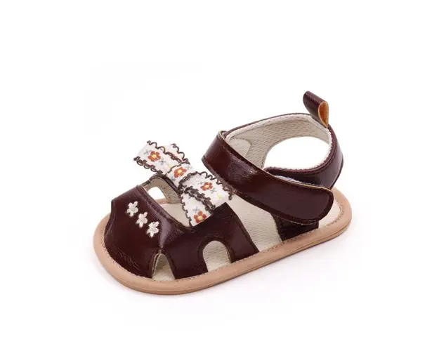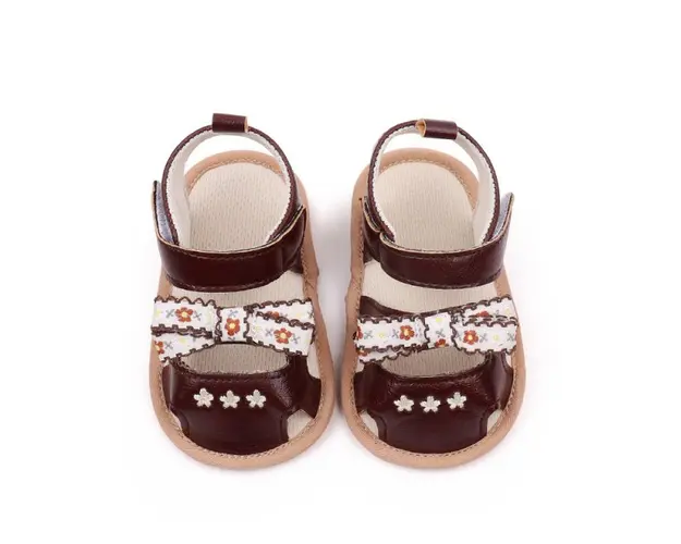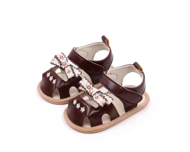 Marimi: 3-6 luni (lungime talpita 11 cm) 9-12 luni (lungime talpita 12 cm) 12-18 luni (lungime talpita 13 cm) Sandale pentru fetite, din material tip piele ecologica, inchise in fata, cu floricele brodate si cu o fundita inflorata aplicata in fata. Se inchid cu bareta cu arici intr-o parte. Culoare: maro Talpa este din cauciuc moale, ideala pentru primii pasi ai micutei. Produsul cu denumirea Sandalute maro cu fundita - Amelia face parte din brandul Eurobaby, se afla in categoria Tetine si subcategoria