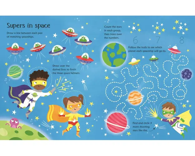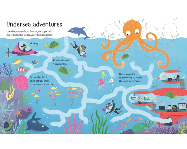 Faceti cunostinta cu Spring, Skydart si prietenii lor super-eroi in aceasta carte de activitati plina de actiune. Exista puncte de unit, diferente de cerc, labirinturi de rezolvat si linii punctate de trasat, precum si o multime de obiecte de gasit, numarat si desenat.Copiii mici se vor bucura sa faca activitatile folosind pixul special, apoi stergand paginile stralucitoare si repetandu-le pe toate. Produsul cu denumirea Scrie si sterge - Carte cu supereroi - Wipe-Clean Superhero Activities face parte din brandul Klorane, se afla in categoria Carte de colorat cu apa si subcategoria Usborne