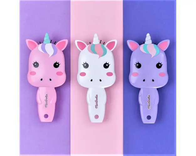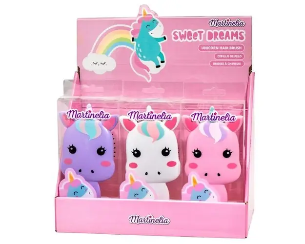 Martinelia Unicorn Hair Brush este o perie de par speciala, in forma de unicorn cu peri moi numai buni pentru descalcit parul. Aranjarea parului devine o activitate distractiva. nbspIdeala pentru toat Produsul cu denumirea Set 12 perii de par pentru copii Sweet Dreams Unicorn Martinelia face parte din brandul Miniland, se afla in categoria Igiena si ingrijire si subcategoria