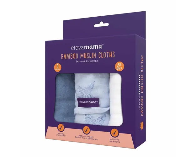 Set 3 paturici de muselina albastru Clevamama 3540Indragitele paturici de muselina matasoase Clevamama sunt realizate din fibra de bambus si bumbac pentru o piele delicata, precum cea a bebelusilor.Ma Produsul cu denumirea Set 3 paturici de muselina albastru Clevamama 3540 face parte din brandul Clevamama, se afla in categoria Costume carnaval copii si subcategoria