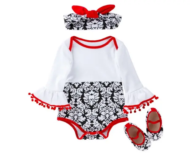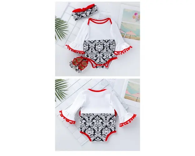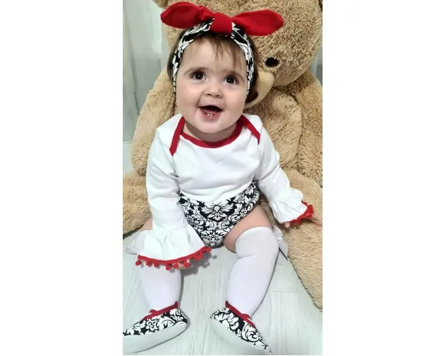 Marimi: 3-6 (59), 6-9 (66), 9-12 (73), 12-18 luni (80) Material: 97% bumbac, 3% elastane Set pentru fetite format din: - body cu maneca lunga, alb cu imprimeu negru in partea de jos, cu manecute evazate si cu ciucurei rosii. Se inchide cu capse intre picioruse. - bentita alb cu negru si fundita rosie; - pantofiori asortati. Produsul cu denumirea Set body cu bentita si pantofiori face parte din brandul Eurobaby, se afla in categoria Tampoane de san si subcategoria