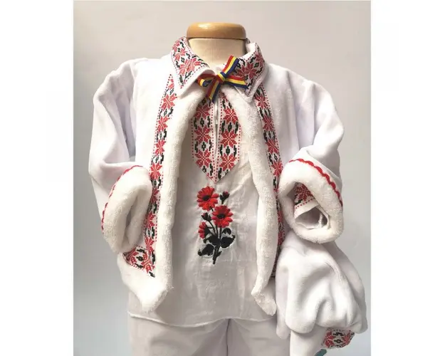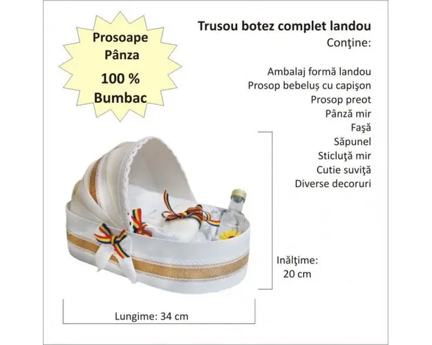 Set botez traditional baietel, trusou botez landou, lumanare si costum popular baiat, Denikos® 968 DESCRIERE Pentru a ne comunica marimea costumasului si orice alte detalii legate de livrarea trusoului, te vom contacta in maxim 48 ore de la inregistrarea comenzii in sistem. Set special creat pentru ceremonia de botez. Setul este alcatuit din trusou complet ambalat intr-o cutie tip landou decorata tradional, o lumanare asortata si un costum botez traditional baieti alb cu broderie traditionala realizat din materiale de cea mai buna calitate (100% bumbac). Setul contine 10 piese: - cutie de trusou in forma de landou; - prosop cu gluga pentru bebelus, dimensiuni 80 x 80 cm, 100% bumbac; - panza de mir, 100% bumbac; - prosop pentru preot, dimensiuni 30 x 50 cm, 100% bumbac; - fasa de botez, dimensiune 150 cm; - sticluta de mir, capacitate 100 ml; - sapunel; - cutiuta pentru suvita de par. - lumanare de botez (35 cm inaltime). - costum botez traditional. Costumul contine: sacou, camansa, pantalon, caciulita. Masuri disponibile costum: 3, 6, 9 luni Produsul cu denumirea Set botez traditional baietel, trusou botez landou, lumanare si costum popular baiat, Denikos® 968 face parte din brandul Produs vandut si livrat de sc denikos creativ shop online srl, se afla in categoria Barbie si subcategoria