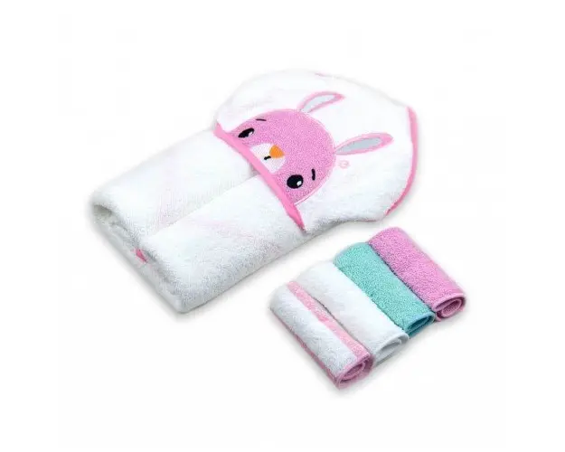 Set cadou bebelusi cu 4 mini prosopele si prosop cu gluga din bumbac iepuras