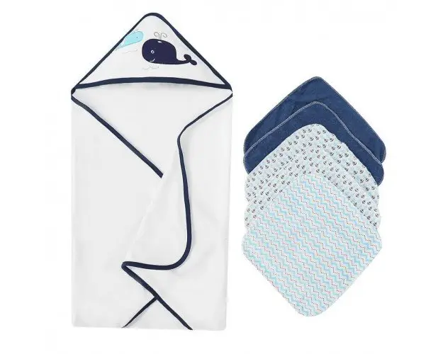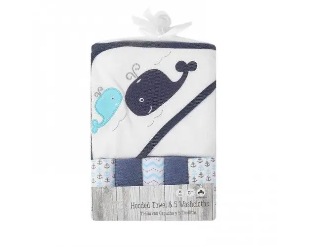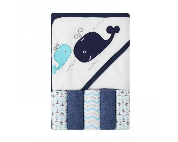 Set cadou bebelusi cu 5 mini prosopele si prosop de baie cu gluga model Marin
