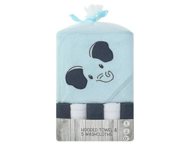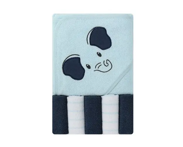 Set cadou bebelusi cu 5 mini prosopele si prosop cu gluga elefant